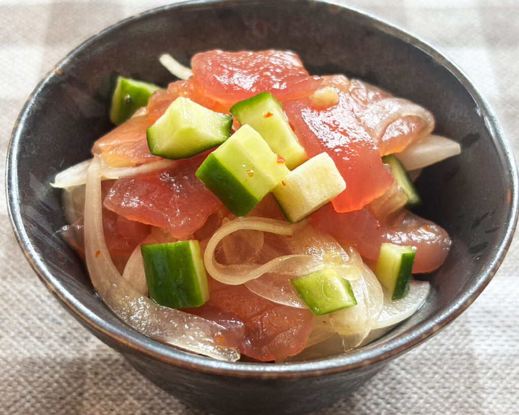 ③☆の調味料を混ぜ、マグロ、玉ねぎ、きゅうりを加えて混ぜ合わせる。