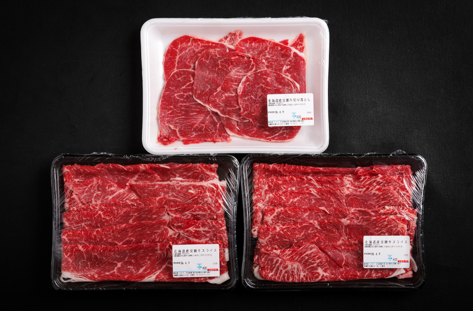 北海道内で肥育・生産された交雑牛(乳用牛と黒毛和牛の交雑種)のウデ肉・モモ肉を使用したスライスセットです。交雑牛は赤身の旨みと程よい霜降りのバランスが良く、脂がしつこくなりすぎないため、食べ飽きしない美味しさが魅力です。